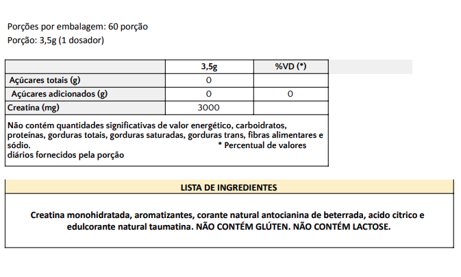 Creatina monohidratada, aromatizantes, corante natural antocianina de beterrada, acido citrico, Vitamina C e edulcorante natural taumatina e edulcorante glicosideos de stevia rebaudiana bertoni NÃO CONTÉM GLÚTEN. NÃO CONTÉM LACTOSE.
