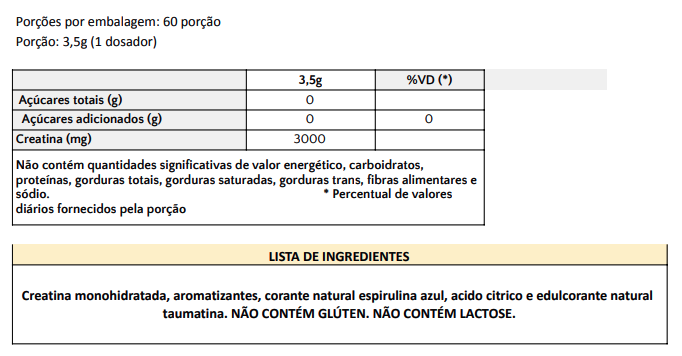 Creatina monohidratada, aromatizantes, corante natural espirulina azul, acido citrico, Vitamina C edulcorante natural taumatina e edulcorante glicosideos de stevia rebaudiana bertoni NÃO CONTÉM GLÚTEN. NÃO CONTÉM LACTOSE.