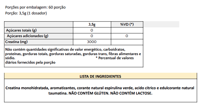 Creatina monohidratada, aromatizantes,Clorofila Cúprica, Vitamina C , acido citrico e edulcorante natural taumatina e edulcorante glicosideos de stevia rebaudiana bertoni NÃO CONTÉM GLÚTEN. NÃO CONTÉM LACTOSE.