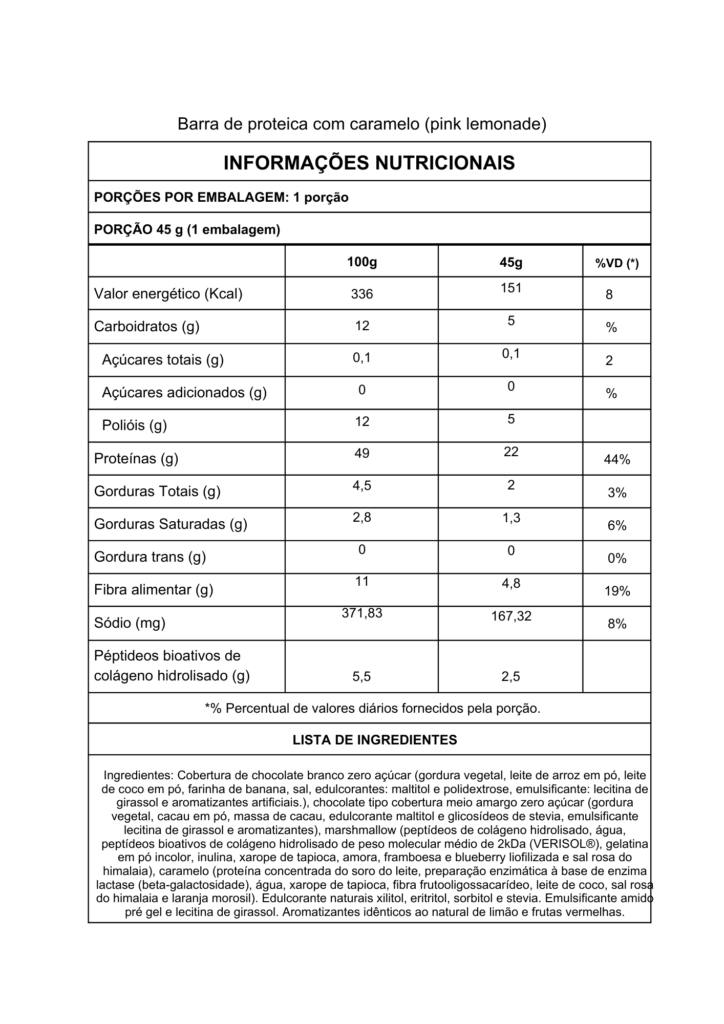Cobertura de chocolate branco zero açúcar (gordura vegetal, leite de arroz em pó, leitede coco em pó, farinha de banana, sal, edulcorantes: maltitol e polidextrose, emulsificante: lecitina degirassol e aromatizantes artificiais.), chocolate tipo cobertura meio amargo zero açúcar (gorduravegetal, cacau em pó, massa de cacau, edulcorante maltitol e glicosídeos de stevia, emulsificantelecitina de girassol e aromatizantes), marshmallow (peptídeos de colágeno hidrolisado, água,peptídeos bioativos de colágeno hidrolisado de peso molecular médio de 2kDa (VERISOL®), gelatinaem pó incolor, inulina, xarope de tapioca, amora, framboesa e blueberry liofilizada e sal rosa dohimalaia), caramelo (proteína concentrada do soro do leite, preparação enzimática à base de enzimalactase (beta-galactosidade), água, xarope de tapioca, fibra frutooligossacarídeo, leite de coco, salrosa do himalaia e laranja morosil). Edulcorante naturais xilitol, eritritol, sorbitol e stevia. Emulsificanteamido pré gel e lecitina de girassol. Aromatizantes idênticos ao natural de limão e frutas vermelhas.Corantes naturais antocianina de cenoura roxa e beterraba. Ácido ascórbico (vitamina C). Acidulanteácido cítrico. Conservante sorbato de potássio e benzoato de sódio.NÃO CONTÉM GLÚTEN . NÃO CONTÉM LACTOSE.ALÉRGICOS: CONTÉM DERIVADOS DE LEITE E SOJA